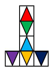 Svarsalternativ 4 är felaktigt eftersom sidan med den gröna triangeln och sidan med den gula triangeln befinner sig på motsatta sidor av den utvikta kuben, och kan alltså inte hamna bredvid varandra.)