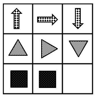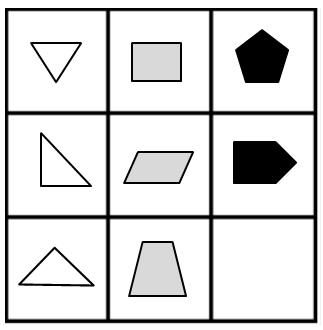 - Vågrätt: Antalet sidor av varje geometrisk figur ökar med en i varje ruta. T.ex., i den översta raden är sekvensen: triangel (3 sidor), kvadrat (4 sidor), pentagon (5 sidor).